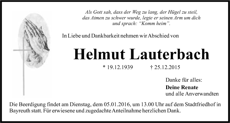 Hier finden Sie alle Traueranzeigen aus der Zeitung, die bisher für Helmut Lauterbach erschienen sind. Weitere Traueranzeigen, die in der Zeitung erscheinen, werden hier ebenfalls aufgelistet