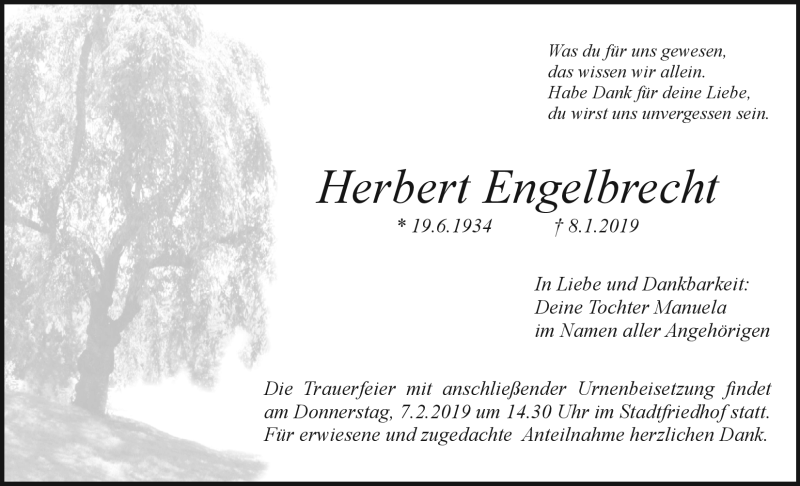Hier finden Sie alle Traueranzeigen aus der Zeitung, die bisher für Herbert Engelbrecht erschienen sind. Weitere Traueranzeigen, die in der Zeitung erscheinen, werden hier ebenfalls aufgelistet