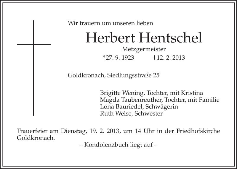 Hier finden Sie alle Traueranzeigen aus der Zeitung, die bisher für Herbert Hentschel erschienen sind. Weitere Traueranzeigen, die in der Zeitung erscheinen, werden hier ebenfalls aufgelistet