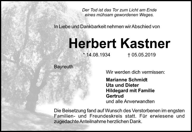 Hier finden Sie alle Traueranzeigen aus der Zeitung, die bisher für Herbert Kastner erschienen sind. Weitere Traueranzeigen, die in der Zeitung erscheinen, werden hier ebenfalls aufgelistet