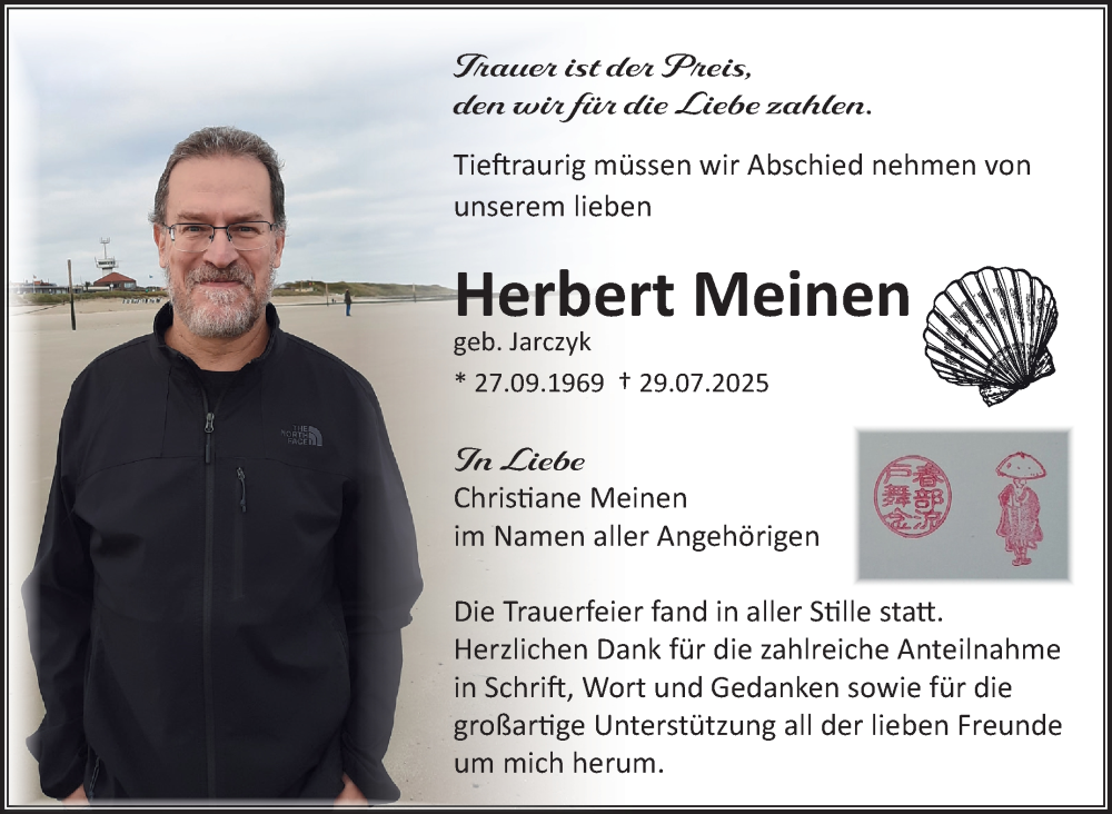 Hier finden Sie alle Traueranzeigen aus der Zeitung, die bisher für Herbert Meinen erschienen sind. Weitere Traueranzeigen, die in der Zeitung erscheinen, werden hier ebenfalls aufgelistet