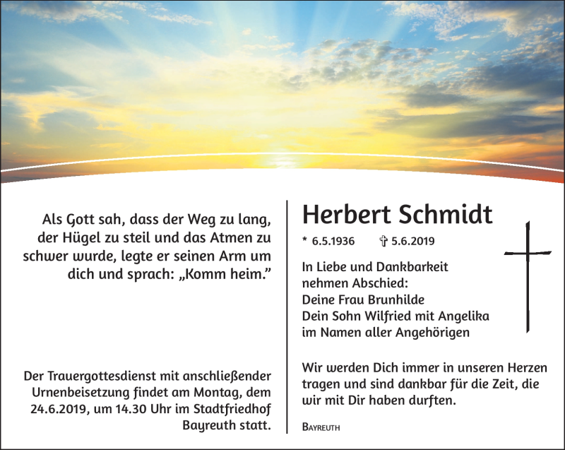 Hier finden Sie alle Traueranzeigen aus der Zeitung, die bisher für Herbert Schmidt erschienen sind. Weitere Traueranzeigen, die in der Zeitung erscheinen, werden hier ebenfalls aufgelistet