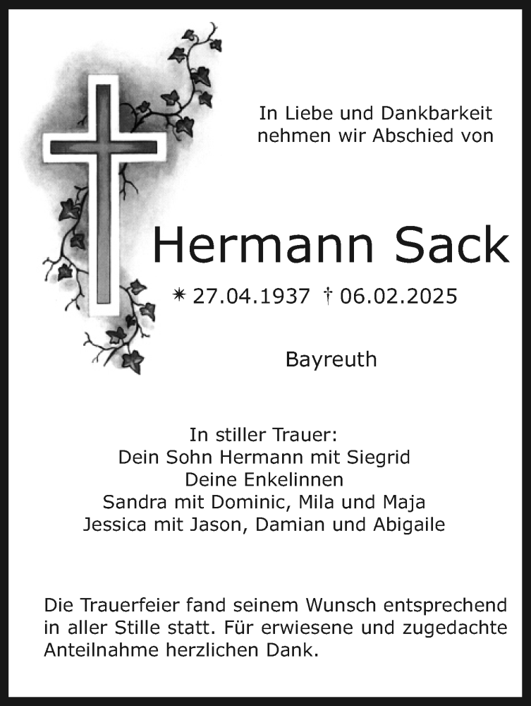 Hier finden Sie alle Traueranzeigen aus der Zeitung, die bisher für Hermann Sack erschienen sind. Weitere Traueranzeigen, die in der Zeitung erscheinen, werden hier ebenfalls aufgelistet