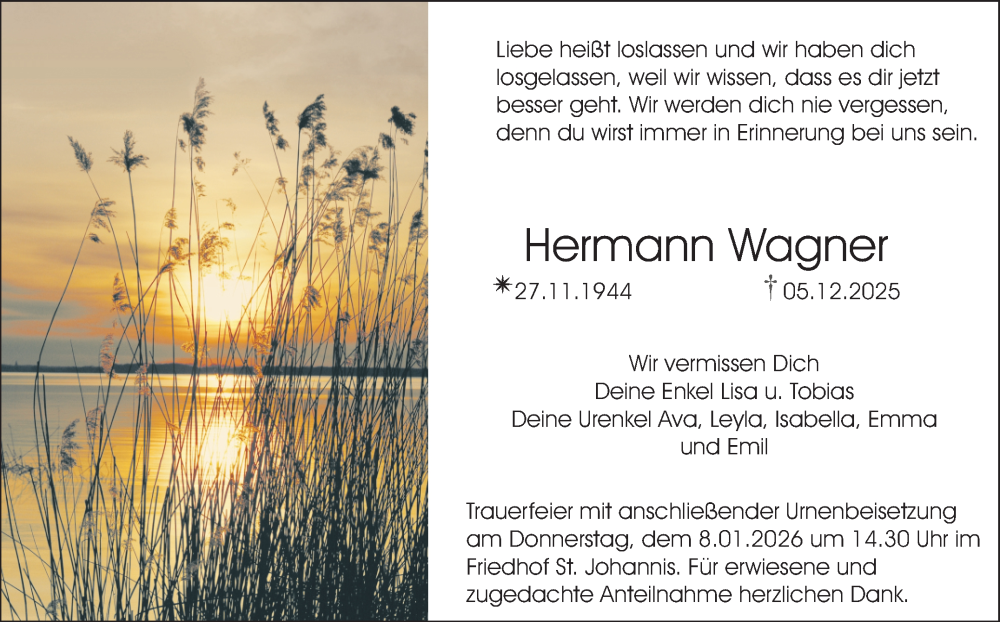 Hier finden Sie alle Traueranzeigen aus der Zeitung, die bisher für Hermann Wagner erschienen sind. Weitere Traueranzeigen, die in der Zeitung erscheinen, werden hier ebenfalls aufgelistet
