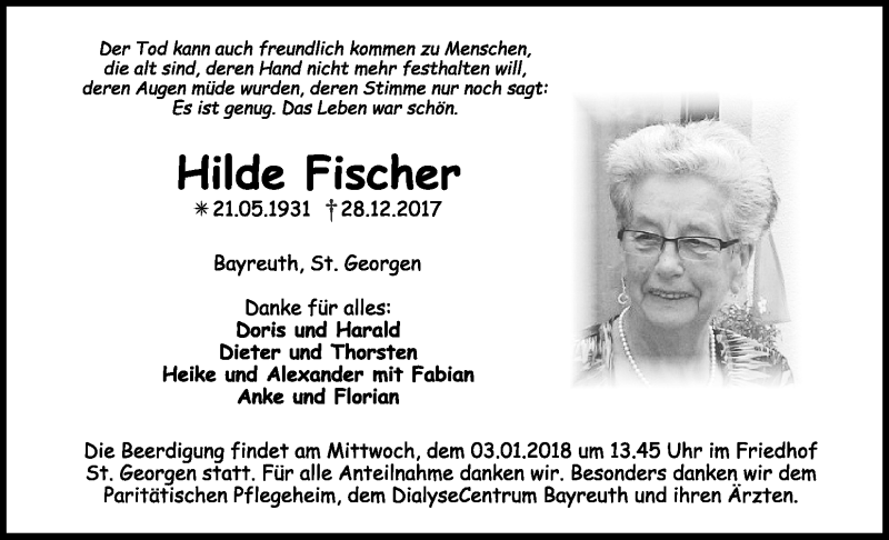Hier finden Sie alle Traueranzeigen aus der Zeitung, die bisher für Hilde Fischer erschienen sind. Weitere Traueranzeigen, die in der Zeitung erscheinen, werden hier ebenfalls aufgelistet