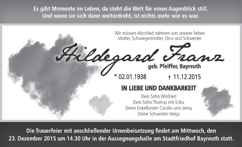 Hier finden Sie alle Traueranzeigen aus der Zeitung, die bisher für Hildegard Franz erschienen sind. Weitere Traueranzeigen, die in der Zeitung erscheinen, werden hier ebenfalls aufgelistet