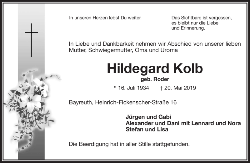 Hier finden Sie alle Traueranzeigen aus der Zeitung, die bisher für Hildegard Kolb erschienen sind. Weitere Traueranzeigen, die in der Zeitung erscheinen, werden hier ebenfalls aufgelistet
