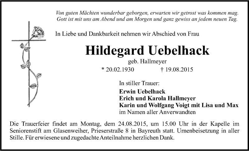 Hier finden Sie alle Traueranzeigen aus der Zeitung, die bisher für Hildegard Uebelhack erschienen sind. Weitere Traueranzeigen, die in der Zeitung erscheinen, werden hier ebenfalls aufgelistet