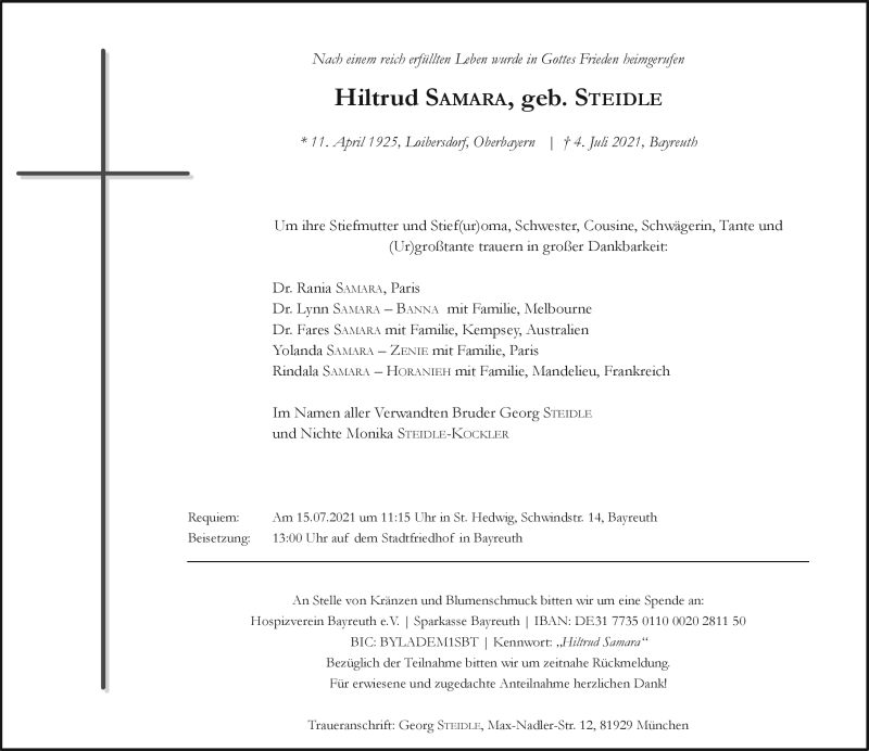 Hier finden Sie alle Traueranzeigen aus der Zeitung, die bisher für Hiltrud Samara erschienen sind. Weitere Traueranzeigen, die in der Zeitung erscheinen, werden hier ebenfalls aufgelistet