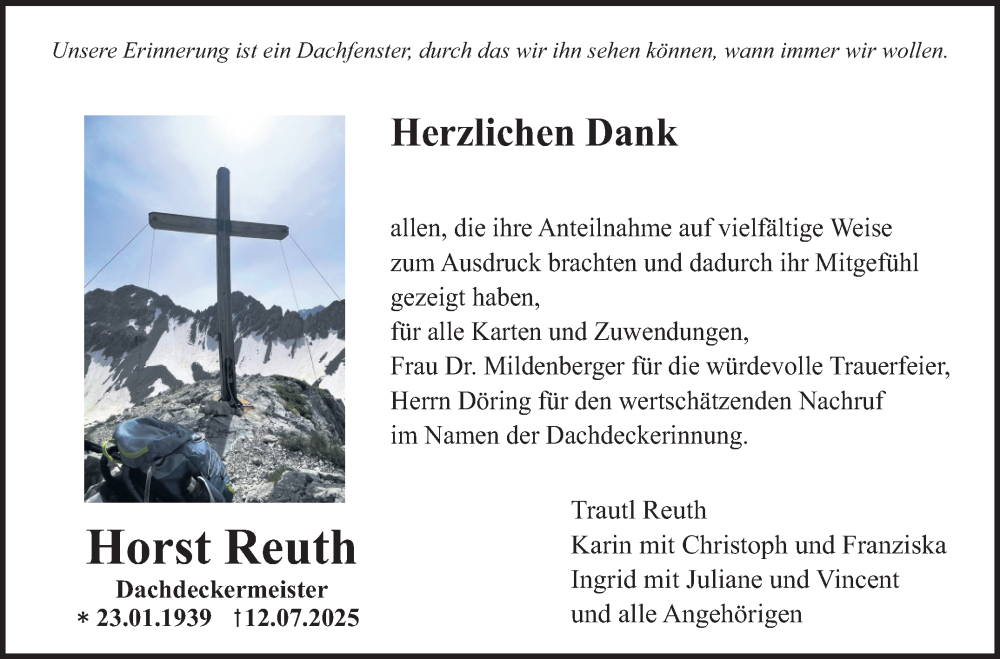 Hier finden Sie alle Traueranzeigen aus der Zeitung, die bisher für Horst Reuth erschienen sind. Weitere Traueranzeigen, die in der Zeitung erscheinen, werden hier ebenfalls aufgelistet