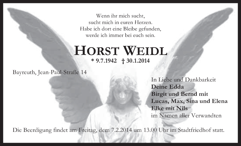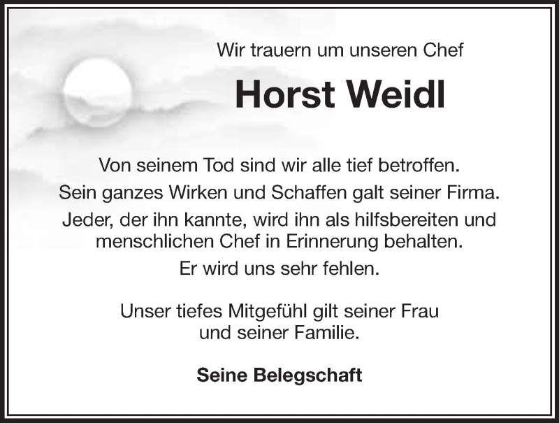 Hier finden Sie alle Traueranzeigen aus der Zeitung, die bisher für Horst Weidl erschienen sind. Weitere Traueranzeigen, die in der Zeitung erscheinen, werden hier ebenfalls aufgelistet