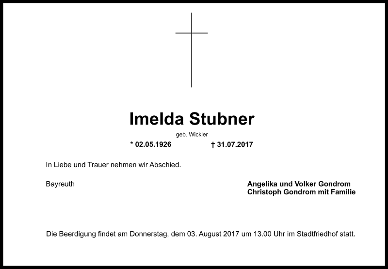 Hier finden Sie alle Traueranzeigen aus der Zeitung, die bisher für Imelda Stubner erschienen sind. Weitere Traueranzeigen, die in der Zeitung erscheinen, werden hier ebenfalls aufgelistet
