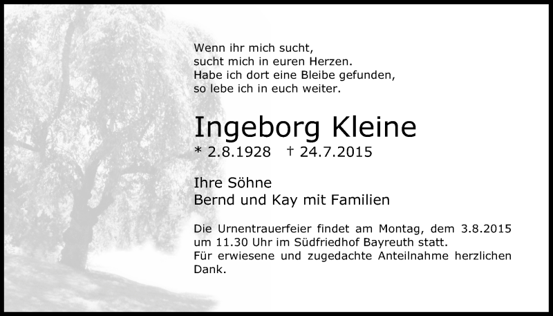 Hier finden Sie alle Traueranzeigen aus der Zeitung, die bisher für Ingeborg Kleine erschienen sind. Weitere Traueranzeigen, die in der Zeitung erscheinen, werden hier ebenfalls aufgelistet