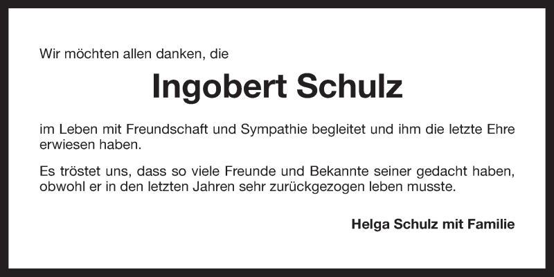 Hier finden Sie alle Traueranzeigen aus der Zeitung, die bisher für Ingobert Schulz erschienen sind. Weitere Traueranzeigen, die in der Zeitung erscheinen, werden hier ebenfalls aufgelistet