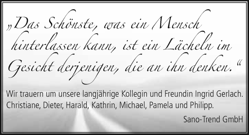Hier finden Sie alle Traueranzeigen aus der Zeitung, die bisher für Ingrid Gerlach erschienen sind. Weitere Traueranzeigen, die in der Zeitung erscheinen, werden hier ebenfalls aufgelistet