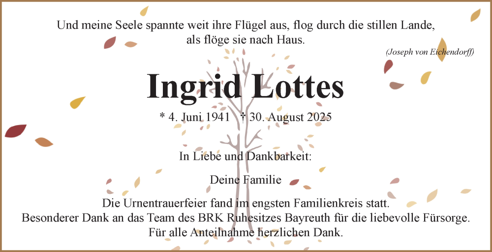 Hier finden Sie alle Traueranzeigen aus der Zeitung, die bisher für Ingrid Lottes erschienen sind. Weitere Traueranzeigen, die in der Zeitung erscheinen, werden hier ebenfalls aufgelistet