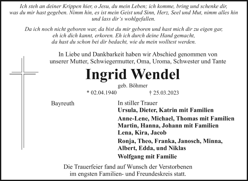 Hier finden Sie alle Traueranzeigen aus der Zeitung, die bisher für Ingrid Wendel erschienen sind. Weitere Traueranzeigen, die in der Zeitung erscheinen, werden hier ebenfalls aufgelistet