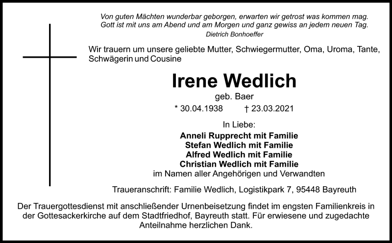 Hier finden Sie alle Traueranzeigen aus der Zeitung, die bisher für Irene Wedlich erschienen sind. Weitere Traueranzeigen, die in der Zeitung erscheinen, werden hier ebenfalls aufgelistet