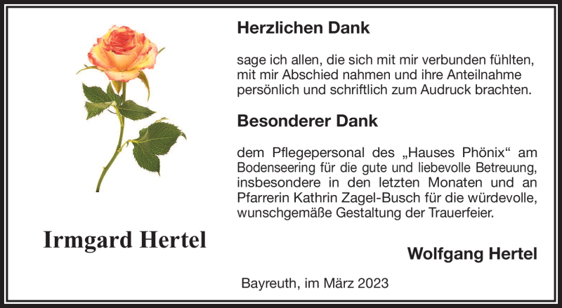 Hier finden Sie alle Traueranzeigen aus der Zeitung, die bisher für Irmgard Hertel erschienen sind. Weitere Traueranzeigen, die in der Zeitung erscheinen, werden hier ebenfalls aufgelistet