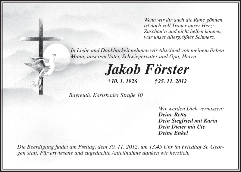 Hier finden Sie alle Traueranzeigen aus der Zeitung, die bisher für Jakob Förster erschienen sind. Weitere Traueranzeigen, die in der Zeitung erscheinen, werden hier ebenfalls aufgelistet