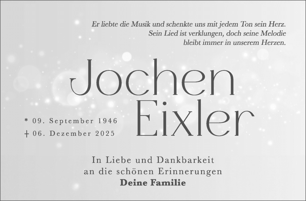 Hier finden Sie alle Traueranzeigen aus der Zeitung, die bisher für Jochen Eixler erschienen sind. Weitere Traueranzeigen, die in der Zeitung erscheinen, werden hier ebenfalls aufgelistet