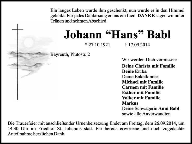 Hier finden Sie alle Traueranzeigen aus der Zeitung, die bisher für Johann Babl erschienen sind. Weitere Traueranzeigen, die in der Zeitung erscheinen, werden hier ebenfalls aufgelistet