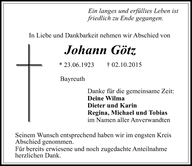 Hier finden Sie alle Traueranzeigen aus der Zeitung, die bisher für Johann Götz erschienen sind. Weitere Traueranzeigen, die in der Zeitung erscheinen, werden hier ebenfalls aufgelistet
