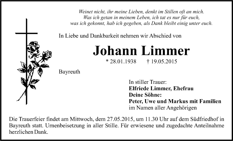 Hier finden Sie alle Traueranzeigen aus der Zeitung, die bisher für Johann Limmer erschienen sind. Weitere Traueranzeigen, die in der Zeitung erscheinen, werden hier ebenfalls aufgelistet