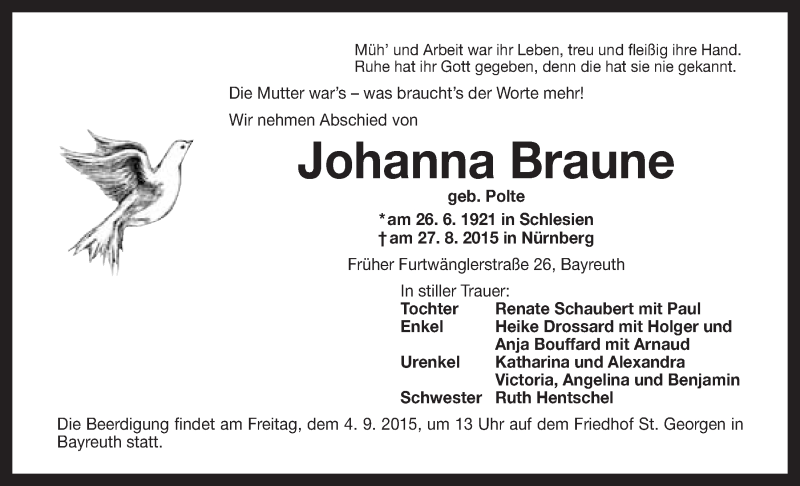 Hier finden Sie alle Traueranzeigen aus der Zeitung, die bisher für Johanna Braune erschienen sind. Weitere Traueranzeigen, die in der Zeitung erscheinen, werden hier ebenfalls aufgelistet