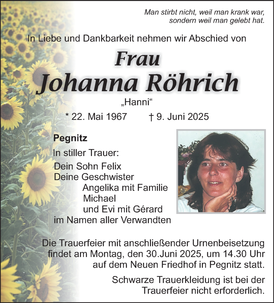 Hier finden Sie alle Traueranzeigen aus der Zeitung, die bisher für Johanna Röhrich erschienen sind. Weitere Traueranzeigen, die in der Zeitung erscheinen, werden hier ebenfalls aufgelistet