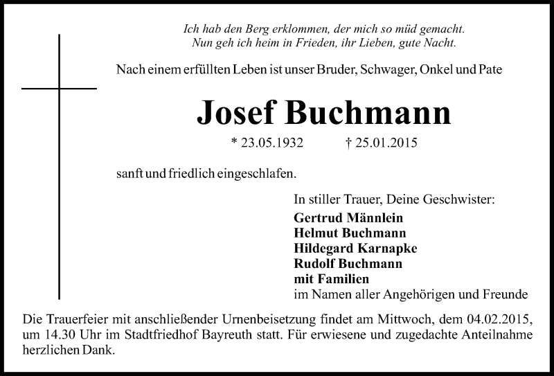 Hier finden Sie alle Traueranzeigen aus der Zeitung, die bisher für Josef Buchmann erschienen sind. Weitere Traueranzeigen, die in der Zeitung erscheinen, werden hier ebenfalls aufgelistet
