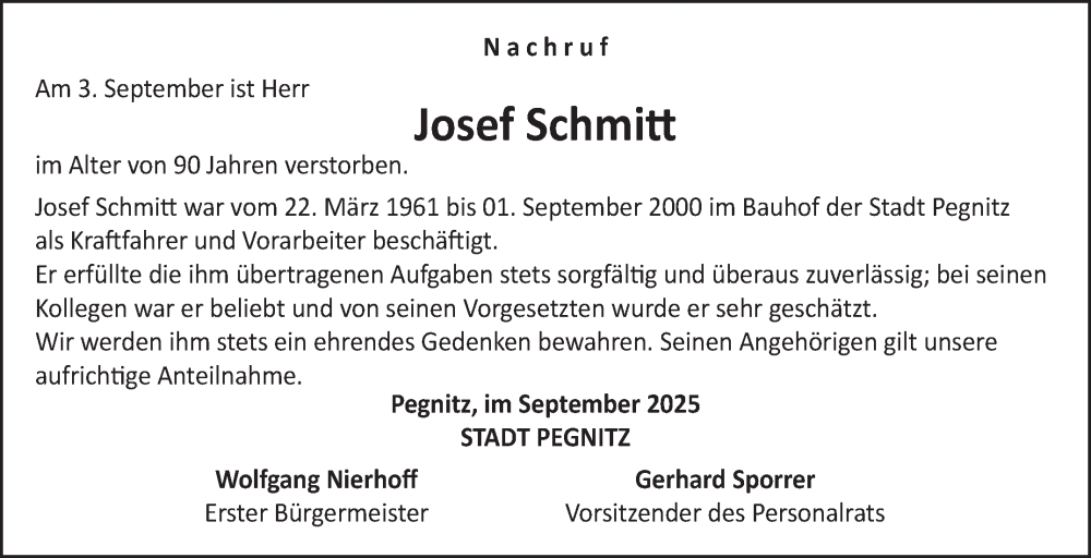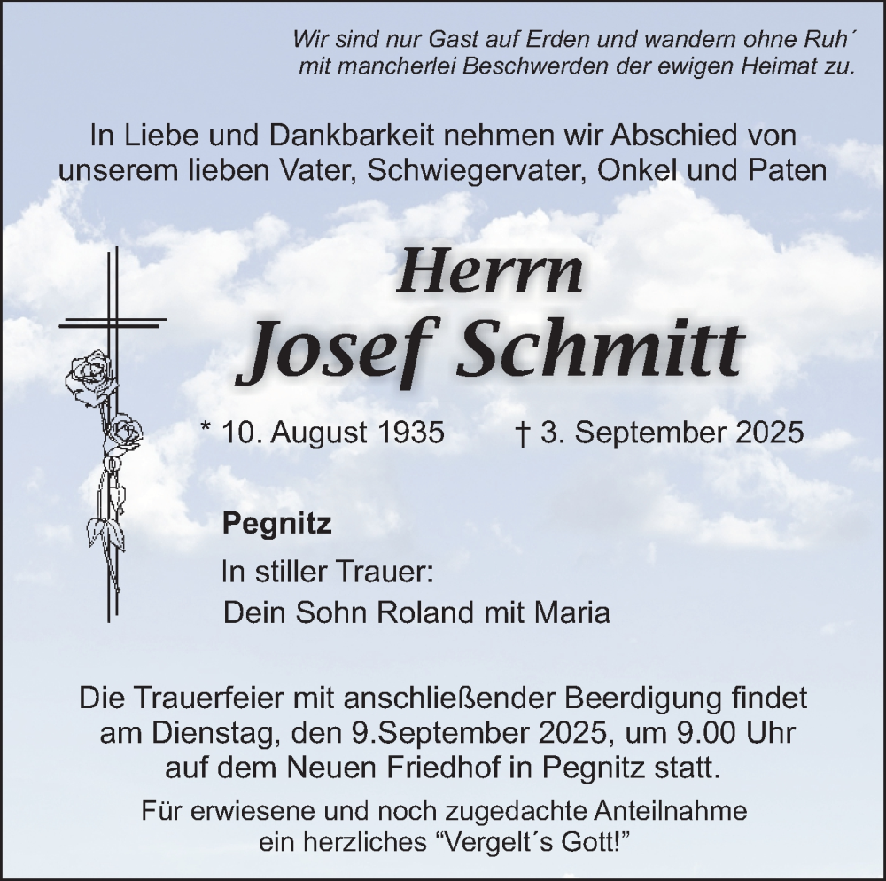 Hier finden Sie alle Traueranzeigen aus der Zeitung, die bisher für Josef Schmitt erschienen sind. Weitere Traueranzeigen, die in der Zeitung erscheinen, werden hier ebenfalls aufgelistet