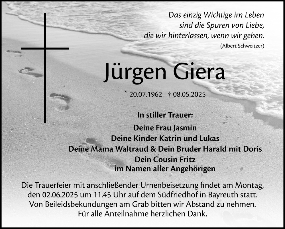 Hier finden Sie alle Traueranzeigen aus der Zeitung, die bisher für Jürgen Giera erschienen sind. Weitere Traueranzeigen, die in der Zeitung erscheinen, werden hier ebenfalls aufgelistet