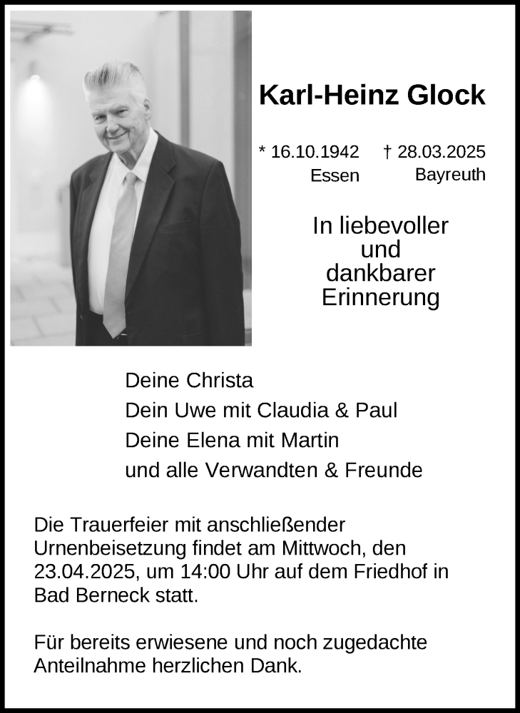 Hier finden Sie alle Traueranzeigen aus der Zeitung, die bisher für Karl-Heinz Glock erschienen sind. Weitere Traueranzeigen, die in der Zeitung erscheinen, werden hier ebenfalls aufgelistet