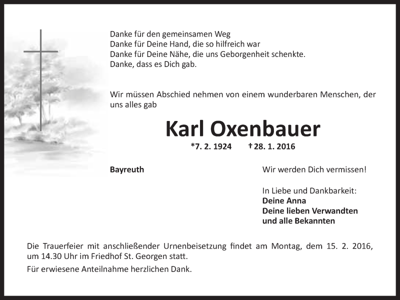 Hier finden Sie alle Traueranzeigen aus der Zeitung, die bisher für Karl Oxenbauer erschienen sind. Weitere Traueranzeigen, die in der Zeitung erscheinen, werden hier ebenfalls aufgelistet