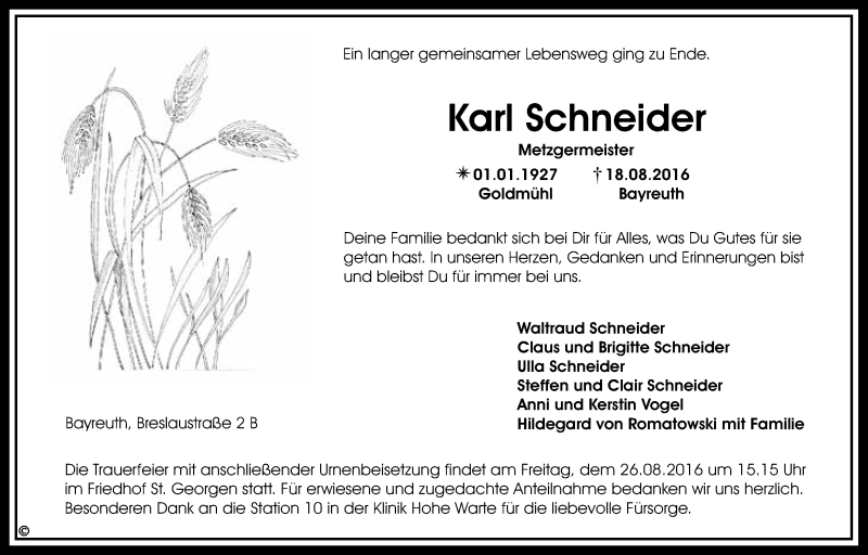 Hier finden Sie alle Traueranzeigen aus der Zeitung, die bisher für Karl Schneider erschienen sind. Weitere Traueranzeigen, die in der Zeitung erscheinen, werden hier ebenfalls aufgelistet
