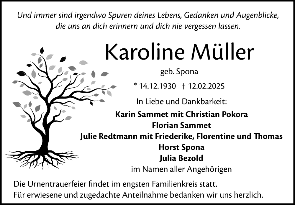 Hier finden Sie alle Traueranzeigen aus der Zeitung, die bisher für Karoline Müller erschienen sind. Weitere Traueranzeigen, die in der Zeitung erscheinen, werden hier ebenfalls aufgelistet