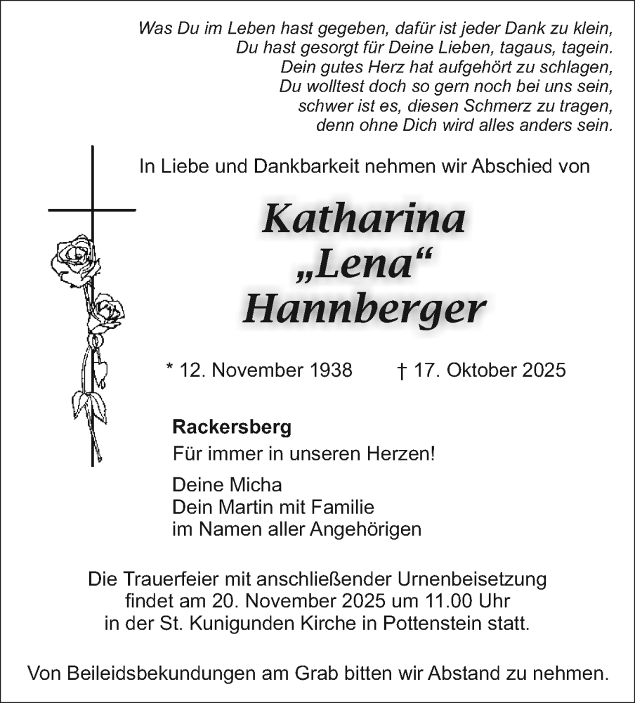 Hier finden Sie alle Traueranzeigen aus der Zeitung, die bisher für Katharina Hannberger erschienen sind. Weitere Traueranzeigen, die in der Zeitung erscheinen, werden hier ebenfalls aufgelistet