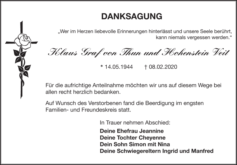 Hier finden Sie alle Traueranzeigen aus der Zeitung, die bisher für Klaus Graf von Thun und Hohenstein Veit erschienen sind. Weitere Traueranzeigen, die in der Zeitung erscheinen, werden hier ebenfalls aufgelistet