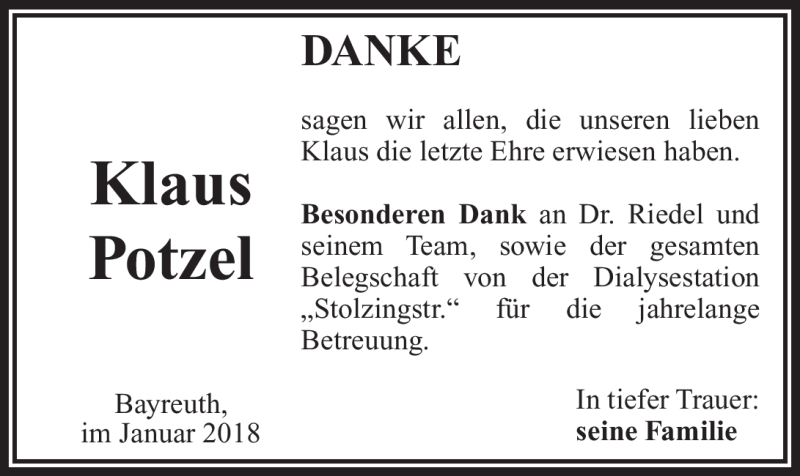 Hier finden Sie alle Traueranzeigen aus der Zeitung, die bisher für Klaus Potzel erschienen sind. Weitere Traueranzeigen, die in der Zeitung erscheinen, werden hier ebenfalls aufgelistet