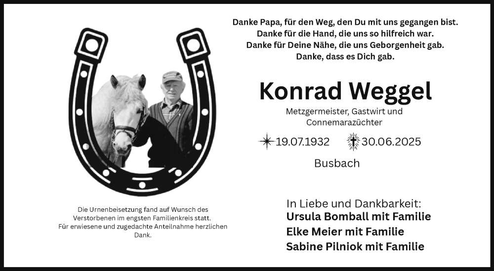 Hier finden Sie alle Traueranzeigen aus der Zeitung, die bisher für Konrad Weggel erschienen sind. Weitere Traueranzeigen, die in der Zeitung erscheinen, werden hier ebenfalls aufgelistet