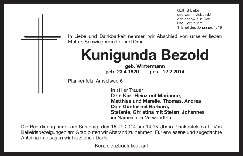 Hier finden Sie alle Traueranzeigen aus der Zeitung, die bisher für Kunigunda Bezold erschienen sind. Weitere Traueranzeigen, die in der Zeitung erscheinen, werden hier ebenfalls aufgelistet