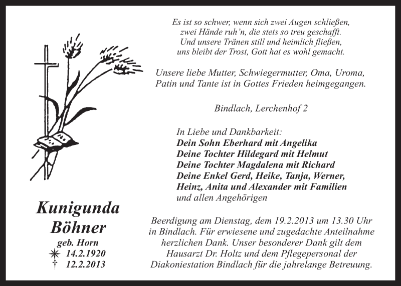 Hier finden Sie alle Traueranzeigen aus der Zeitung, die bisher für Kunigunda Böhner erschienen sind. Weitere Traueranzeigen, die in der Zeitung erscheinen, werden hier ebenfalls aufgelistet