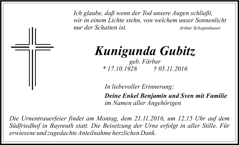 Hier finden Sie alle Traueranzeigen aus der Zeitung, die bisher für Kunigunda Gubitz erschienen sind. Weitere Traueranzeigen, die in der Zeitung erscheinen, werden hier ebenfalls aufgelistet