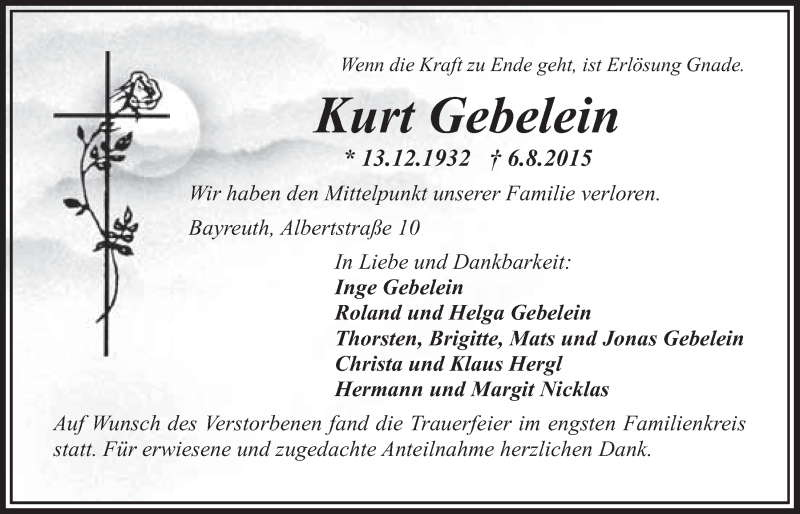 Hier finden Sie alle Traueranzeigen aus der Zeitung, die bisher für Kurt Gebelein erschienen sind. Weitere Traueranzeigen, die in der Zeitung erscheinen, werden hier ebenfalls aufgelistet