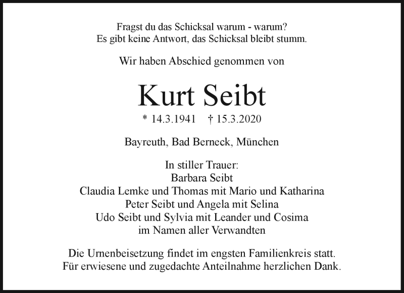 Hier finden Sie alle Traueranzeigen aus der Zeitung, die bisher für Kurt Seibt erschienen sind. Weitere Traueranzeigen, die in der Zeitung erscheinen, werden hier ebenfalls aufgelistet