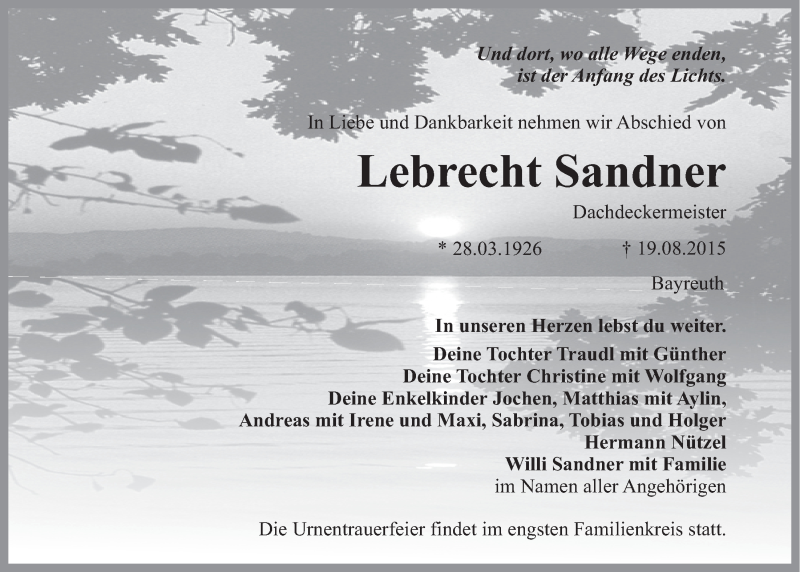 Hier finden Sie alle Traueranzeigen aus der Zeitung, die bisher für Lebrecht Sandner erschienen sind. Weitere Traueranzeigen, die in der Zeitung erscheinen, werden hier ebenfalls aufgelistet