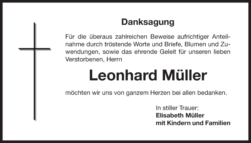 Hier finden Sie alle Traueranzeigen aus der Zeitung, die bisher für Leonhard Müller erschienen sind. Weitere Traueranzeigen, die in der Zeitung erscheinen, werden hier ebenfalls aufgelistet