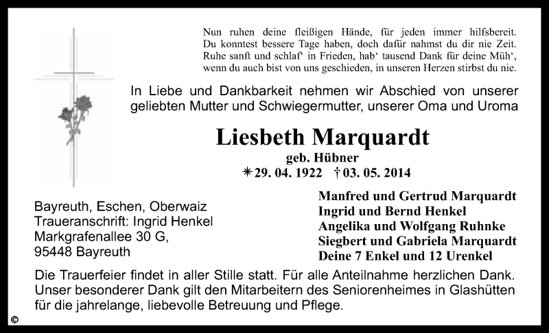 Hier finden Sie alle Traueranzeigen aus der Zeitung, die bisher für Liesbeth Marquardt erschienen sind. Weitere Traueranzeigen, die in der Zeitung erscheinen, werden hier ebenfalls aufgelistet