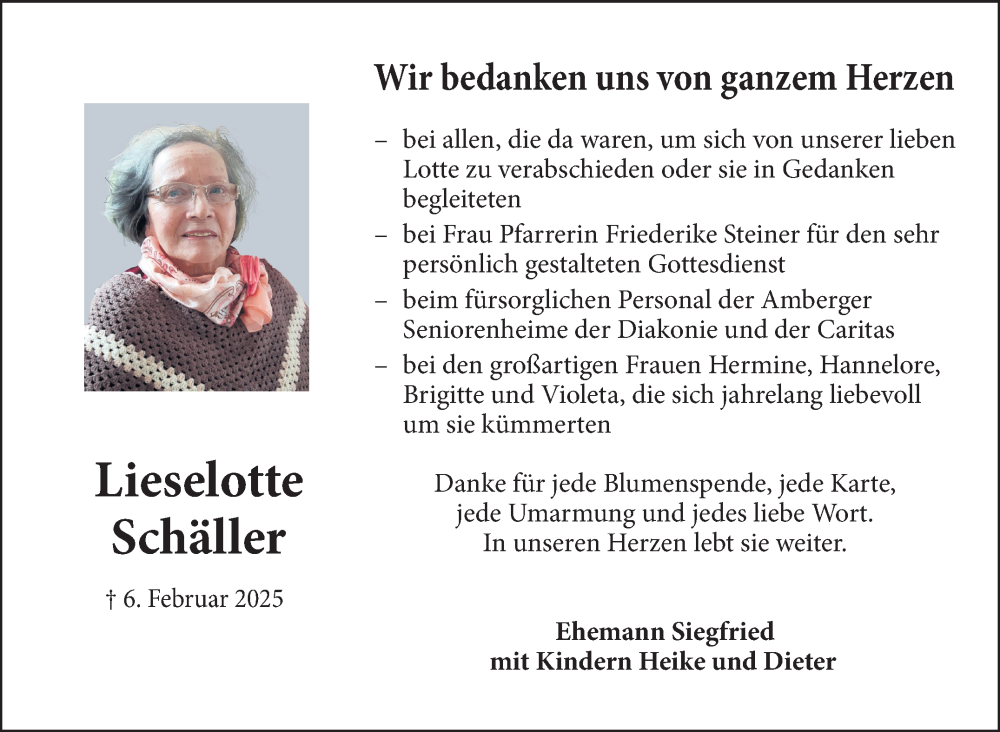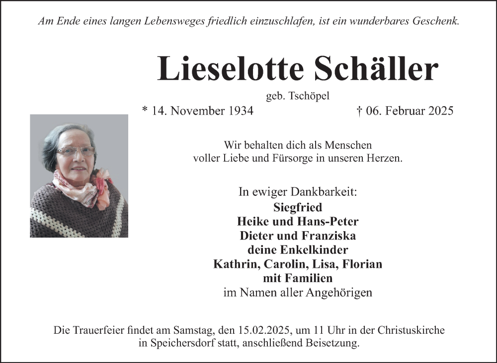 Hier finden Sie alle Traueranzeigen aus der Zeitung, die bisher für Lieselotte Schäller erschienen sind. Weitere Traueranzeigen, die in der Zeitung erscheinen, werden hier ebenfalls aufgelistet